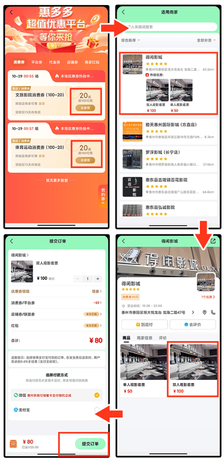 点击【去使用】→选择使用的商家→选择使用的商品→支付订单(支持微信或支付宝支付,钱包余额不能和惠民消费券叠加使用)