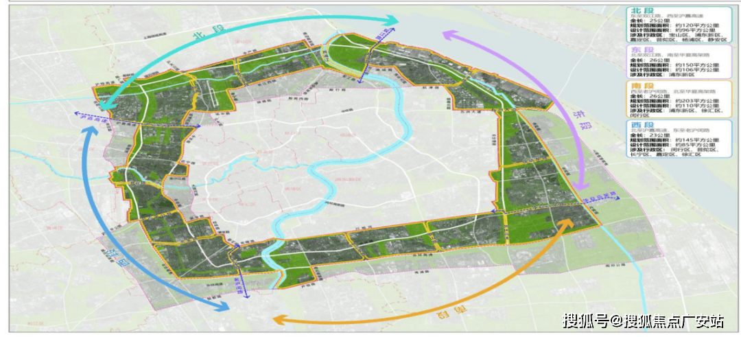 十四五规划金色中环进入2.0版发展阶段——开始上海金色中城新篇章,城市设计方案征集正式启动,规划能级从区级提升至市级对齐纽约“曼哈顿中城”。囊括浦东新区、普陀区、长宁区、徐汇区、闵行区、宝山区、嘉定区7个行政区,分为四段、十六个单元,同时聚焦上海下一条轨交环线号线及沿线重点板块,如张江科学城、漕河泾开发区等关键节点,以优化交通体系与产业布局。(从区级向市级能级跳跃)