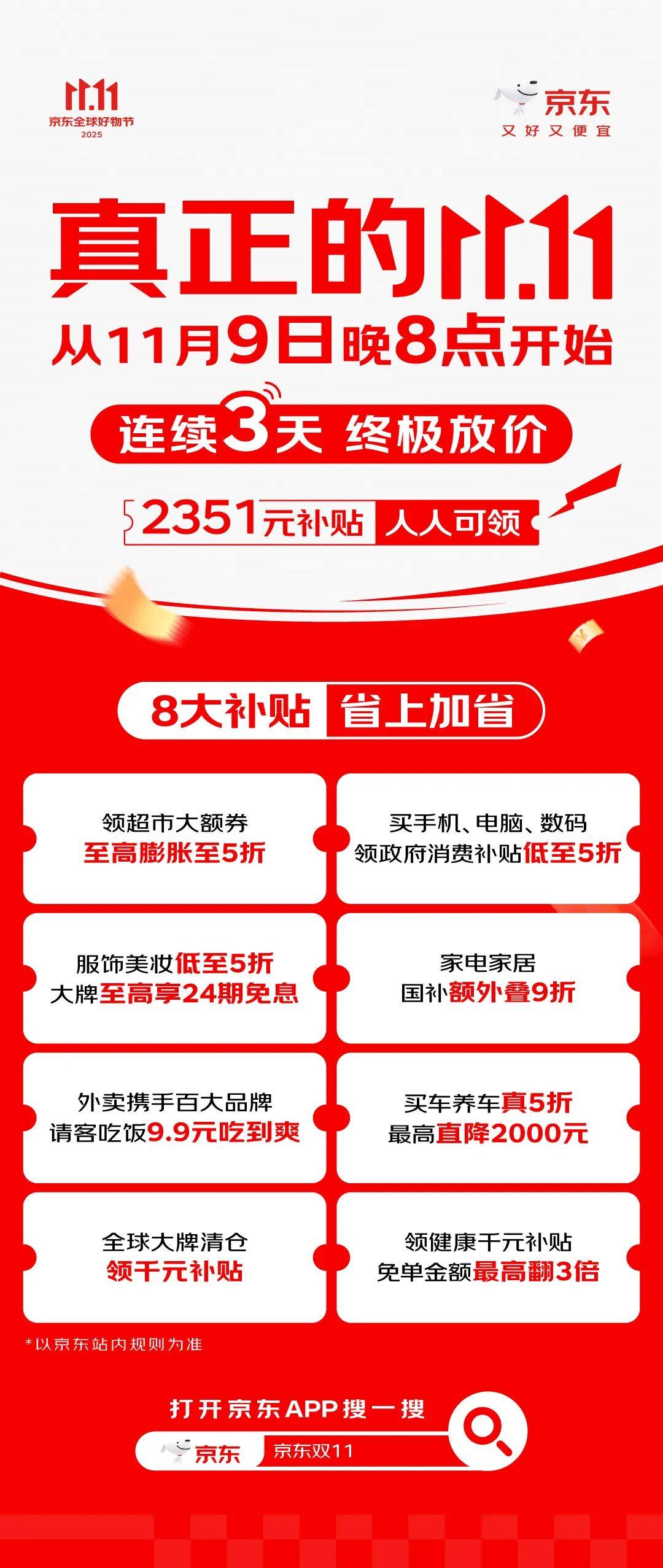 数码家电同样优惠拉满,手机、电脑等数码产品享政府消费补贴,优惠后低至5折;家电家居叠加国补及9折优惠,装修采购一站省心。汽车养护推出线折福利,最高直降2000元;全球大牌清仓专场发放千元补贴,奢侈品、进口好物低价入手。健康品类也推出千元补贴,免单金额最高翻3倍,全面守护家人健康。从日用百货到生活所需,京东以全品类覆盖、全链路补贴打造无死角省钱体验。11月9日晚8点,京东11.11终极放价正式开启!“又好又便宜”的极致消费体验,只等你来!