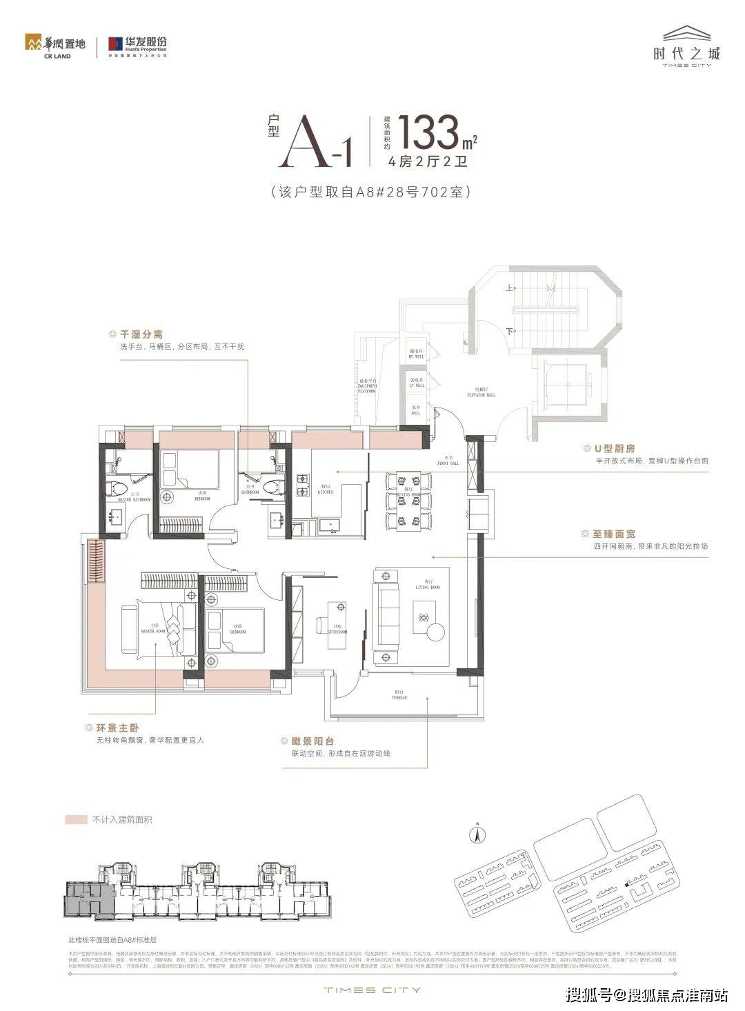 建筑面积约133㎡四房两厅二卫,该户型四开间朝南四房配置,有两点很独特: